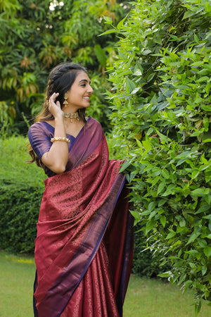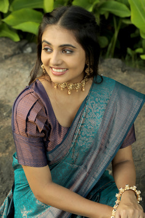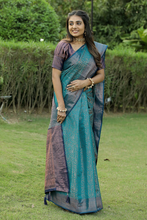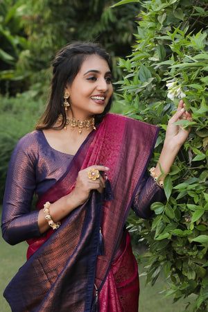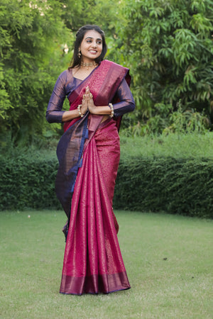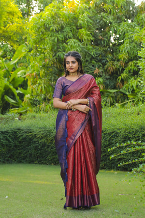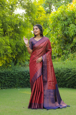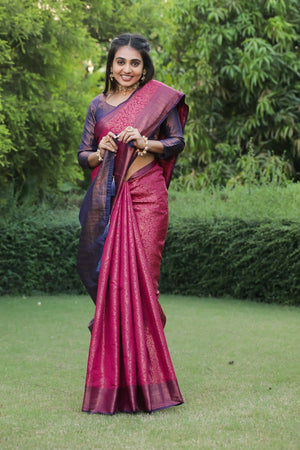 Bringing the best of the traditions on a saree, this piece is composed of poise and elegance. With carefully selected designs and rich border, no wardrobe is complete without this saree.