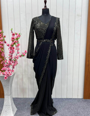 SOMVATI Chic Black Zigzag Embroidered Pure Georgette Bollywood Saree: Dazzling Jari Thread and Sequence Detailing