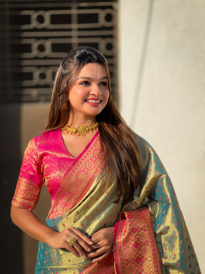 Bringing tradition and elegance to life, this SOMVATI saree is a perfect blend of grace and charm. With intricate zari weaving and a rich contrast border, this piece adds a timeless appeal to your wardrobe.