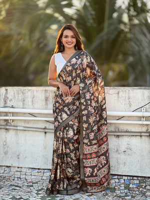 Bringing a classic touch to modern saree designs, this SOMVATI Tussar Silk saree showcases intricate prints across the body, accentuated by a 3-inch zari-woven border on both sides. The rich digitally printed pallu and matching running blouse make this saree an exquisite choice for any occasion.